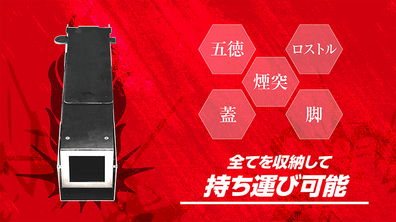【S★Teamers ロケットストーブ】梱包内容/ ●ロケットストーブ本体(煙突、脚一体型本体・五徳・ロストル・焚き火台蓋・煙突固定用の金具×2) ●専用バッグ ●取扱説明書 *画像は開発中のものになります。